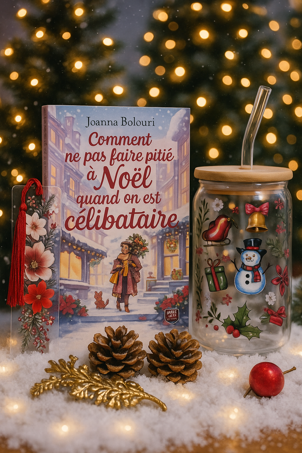 Un coffret chaleureux pour remercier une enseignante : un livre poche de Noël (au choix), un marque-page festif et un verre illustré.
