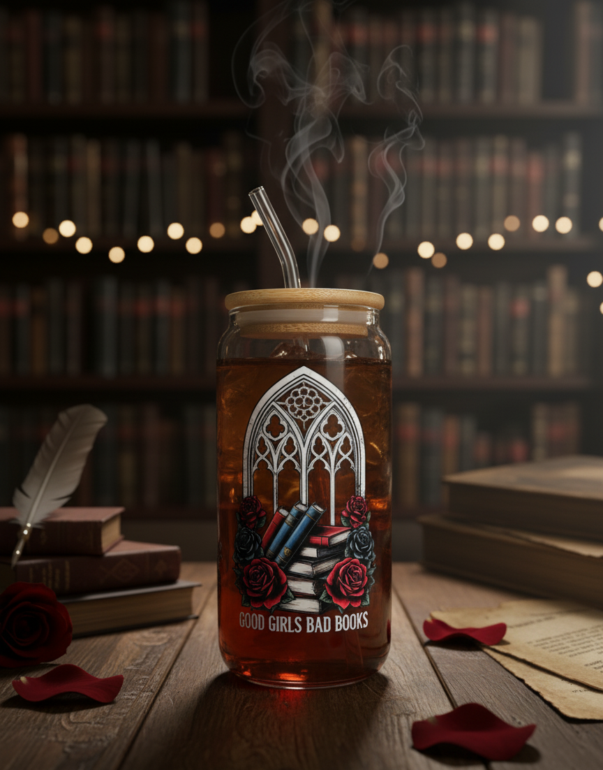 Ce verre est l'emblème de ceux qui préfèrent les zones d'ombre aux lignes claires. Il rend hommage aux personnages aux intentions ambiguës, à ces héros et héroïnes qui nous font douter, pleurer, et tomber amoureux de leurs "défauts". Avec ses motifs gothiques, ses crânes élégants et la devise du club de lecture le plus sulfureux, le Verre Morally Grey est l'accessoire indispensable pour savourer vos romans où la morale est un luxe et la passion, une nécessité.